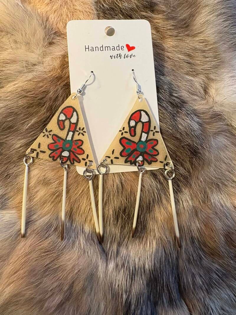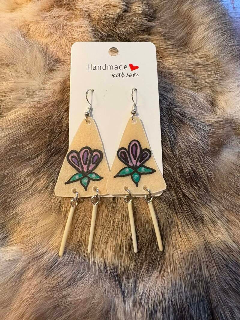 Peinture acrylique sur cuir de chevreuil brut et épines de porc-épic : 35$